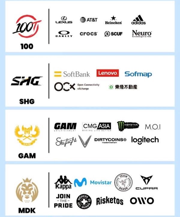 T1:三星、红牛、耐克、奔驰、拉夫劳伦、汇丰银行、Secret Lab、GOALSTUDIO(新生代服装品牌、T1队服赞助商)、韩亚银行、赛睿等
