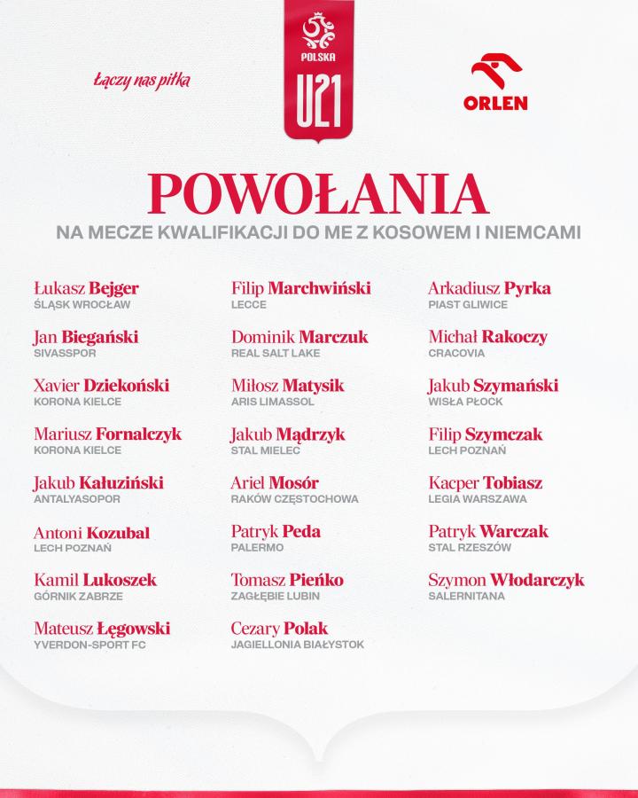 波兰足球资讯当地时间10月1日,波兰U21主帅马耶夫斯基公布了十月份欧青预选赛的大名单,马尔赫温斯基领衔,沃达尔奇克回归。