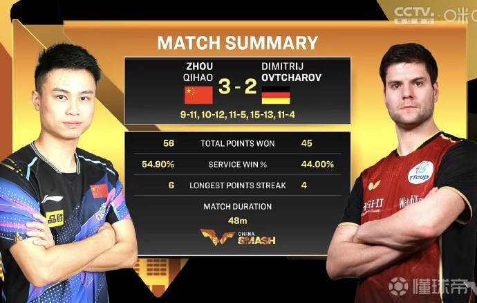 本场比赛,奥恰洛夫率先进入状态,利用发球迫使周启豪主动失误,实现大比分2-0领先。随后三局,周启豪主动开长,利用长球进攻和多拍相持逐渐挽回颓势,最终成功实现大逆转,以3-2击败对手,晋级下一轮。