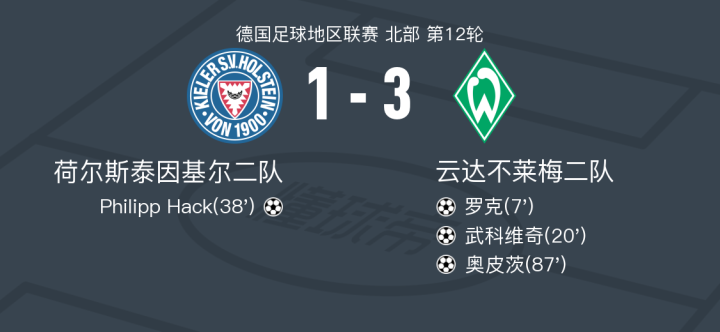云达不莱梅二队3-1荷尔斯泰因基尔二队取德地区3连胜,奥皮茨、武科维奇破门
