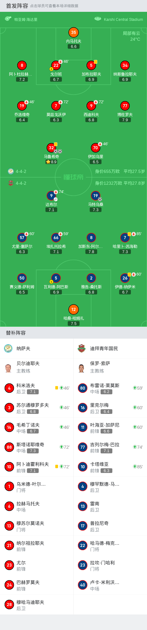 在亚足联冠军联赛小组赛第二轮的比赛中,纳萨夫迎战迪拜青年国民。比赛中,迪拜青年国民的达布尔助攻马特乌桑率先破门,为球队取得领先。随后,纳萨夫的斯塔诺耶维奇助攻马鲁希奇扳平比分。比赛接近尾声时,纳萨夫的阿卜迪霍利科夫再次助攻马鲁希奇,完成绝杀。最终,纳萨夫以2-1战胜迪拜青年国民,马鲁希奇在比赛中梅开二度,成为球队获胜的关键人物。