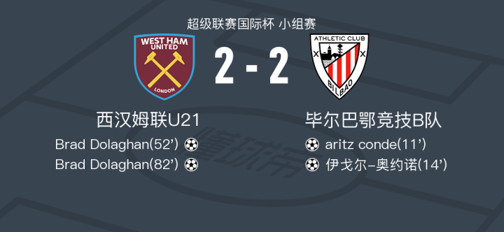 西汉姆联U21 2-2毕尔巴鄂竞技B队,aritz conde首开记录,Brad Dolaghan扳平比分