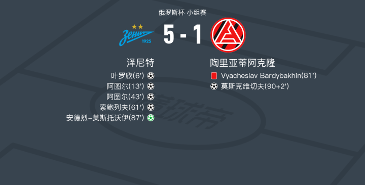 泽尼特5-1大胜陶里亚蒂阿克隆,阿图尔梅开二度,安德烈-莫斯托沃伊传射