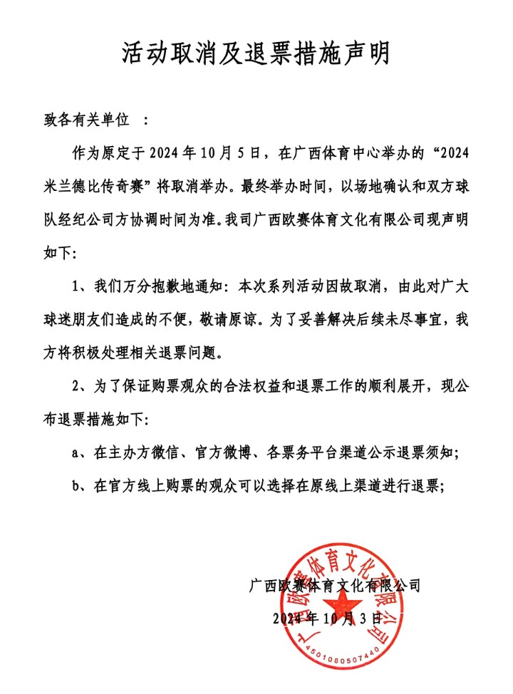 作为原定于2024年10月5日,在广西体育中心举办的“2024米兰德比传奇赛”将取消举办。最终举办时间,以场地确认和双方球队经纪公司方协调时间为准。