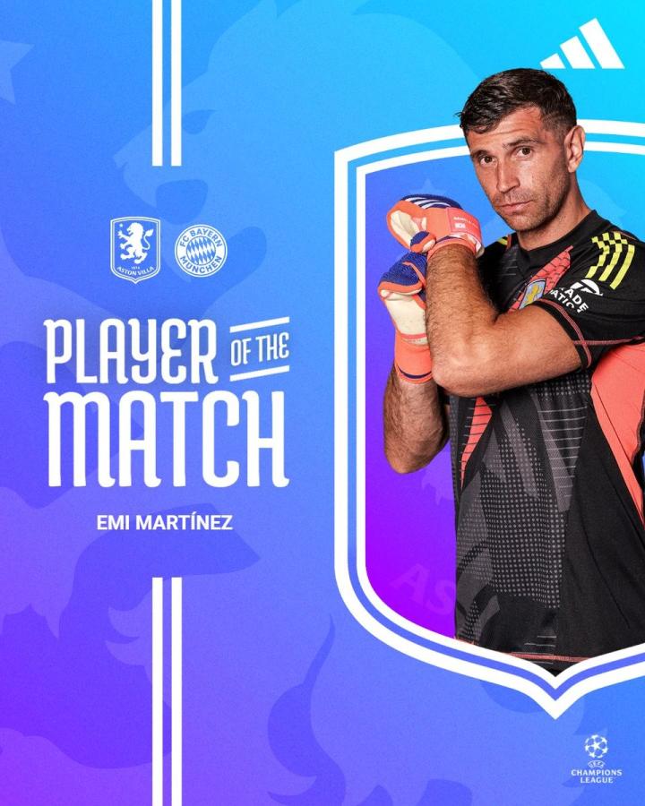 维拉官方宣布,门将达米安-马丁内斯当选球队与拜仁慕尼黑一役队内最佳球员。