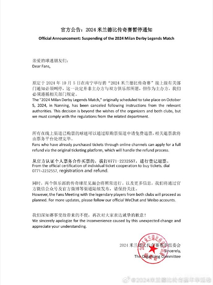 北京时间10月3日,2024米兰德比传奇赛官方账号发布公告,原定于2024年10月5日在南宁举行的“2024米兰德比传奇赛”接上级有关部门通知必须叫停,但球星见面会将照常进行。米兰与国米两家俱乐部也同时发布声明。
