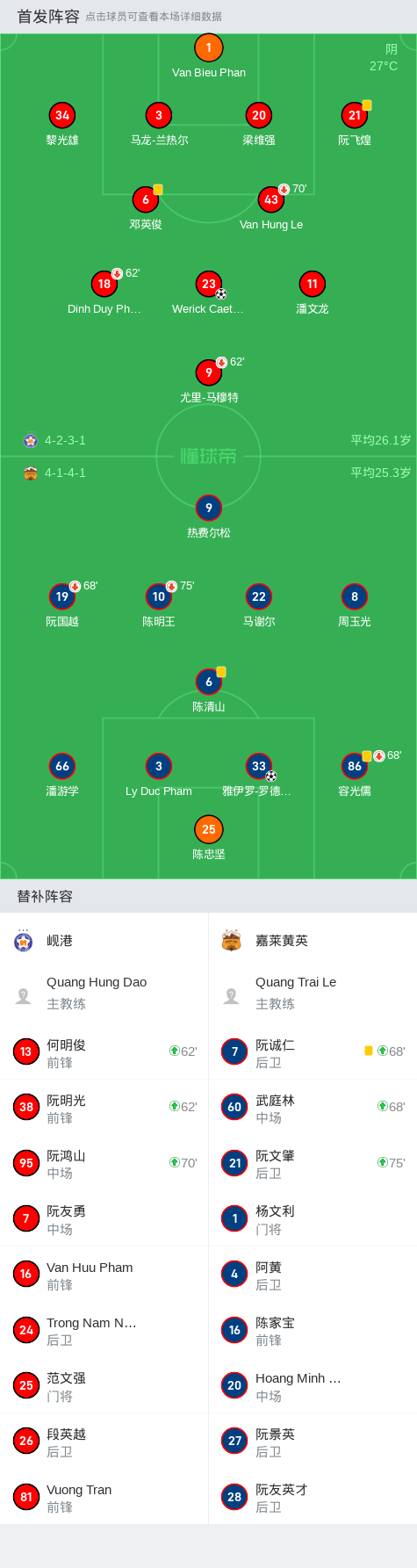 岘港1-1嘉莱黄英,雅伊罗-罗德里格斯打破僵局,Werick Caetano扳平