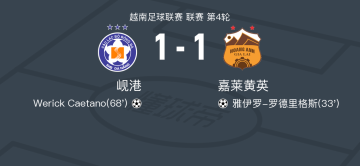 在越南足球联赛第4轮的较量中,岘港坐镇主场迎战嘉莱黄英。比赛中,嘉莱黄英的雅伊罗-罗德里格斯率先为球队取得进球。随后,岘港的Werick Caetano也为主队扳平比分。最终,双方以1-1握手言和。