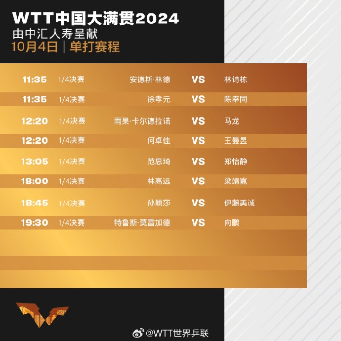 北京时间10月3日,WTT中国大满贯结束第5个比赛日。男单女单八强出炉,张本智和遭莫雷加德淘汰,后者将在1/4决赛面对向鹏;马龙在1/4决赛面对巴西名将雨果,孙颖莎则将在女单1/4决赛遭遇伊藤美诚。此外,两对中国组合林诗栋/蒯曼、林高远/王艺迪会师混双决赛。
