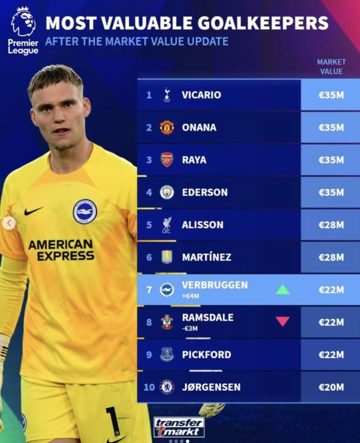 北京时间10月3日晚,德国转会市场更新了英超球员身价,并盘点了英超门将身价榜,其中维卡里奥、奥纳纳、拉亚前三。