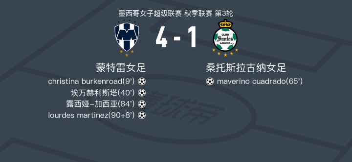 下半场补时第8分钟,蒙特雷女足球员lourdes martinez打入一球。