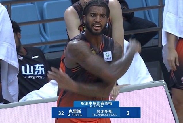 北京时间10月4日,在CBA季前赛山东男篮对阵天津男篮的比赛中,山东队外援克里斯在第三节因与时德帅的冲突吃到个人本场第二次技术犯规,被取消比赛资格。