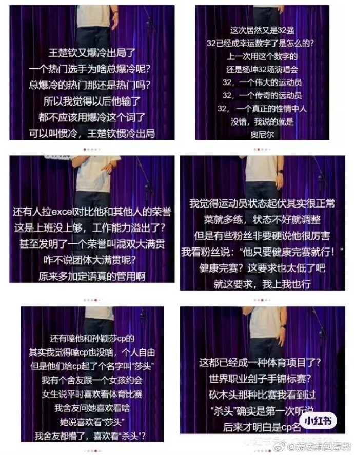 该脱口秀演员针对王楚钦再次爆冷止步32强一事发布了6张图片,图片中配有调侃性质的段子。