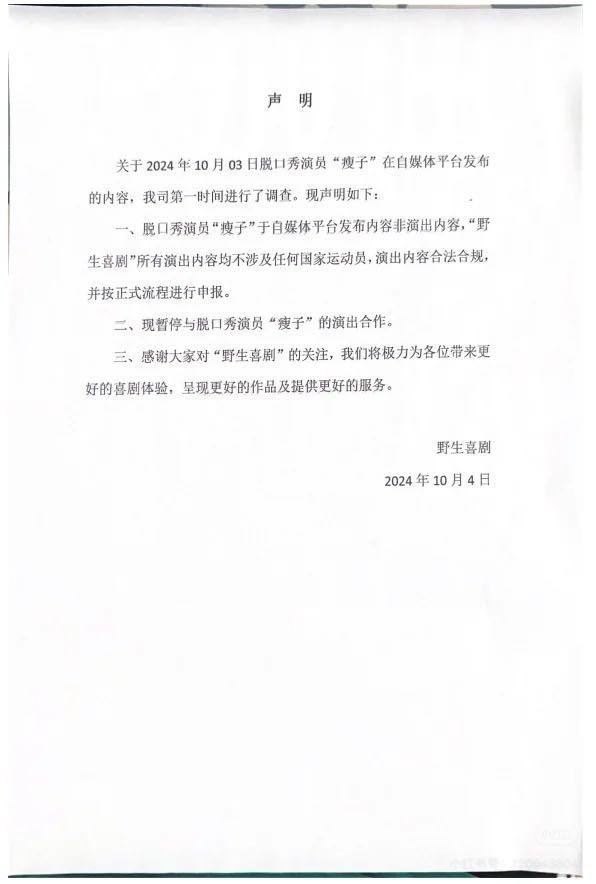 而对于脱口秀演员瘦子的行为在网络上引发的争议,其所属喜剧公司“野生喜剧”也于10月4日做出回应,表示相关争议内容非演出内容,并表示已暂停与脱口秀演员“瘦子”的演出合作。