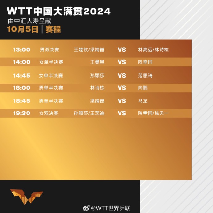 10月4日,WTT中国大满贯男单四分之一决赛全部结束,马龙、梁靖崑、向鹏、林诗栋四名国乒选手顺利晋级半决赛,包揽了男单四强。