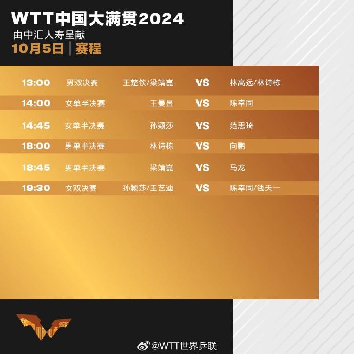 北京时间10月4日,WTT中国大满贯结束第六个比赛日争夺,国乒已经确定拿到全部五个项目的金牌。国乒包揽男单、女单四强,其中向鹏力克奥运会亚军莫雷高德,孙颖莎横扫老对手伊藤美诚;混双决赛,林诗栋/蒯曼击败队友林高远/王艺迪,夺得冠军。