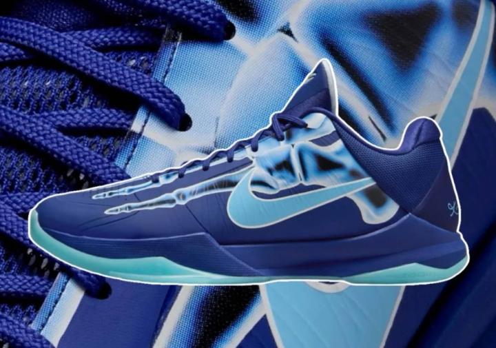整双鞋以深蓝色打底,Swoosh和鞋底以及鞋舌的科比经典Logo等细节均以冰川蓝呈现。最亮眼的莫过于覆盖整个鞋身的X光骨骼印花,呈现出的效果相当炸裂。