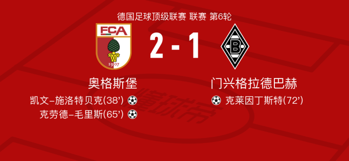 奥格斯堡vs门兴格拉德巴赫球员评分:克莱因丁斯特8.0分,卢卡-内茨5.9分