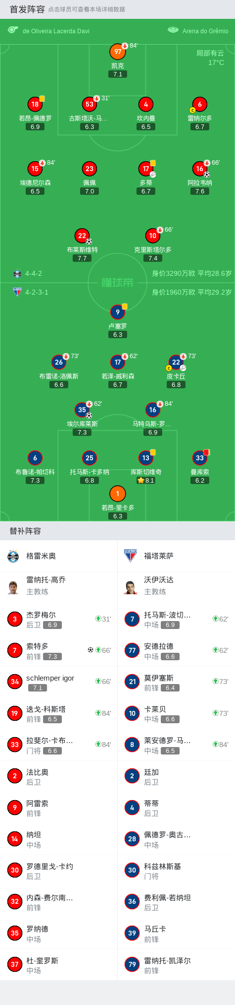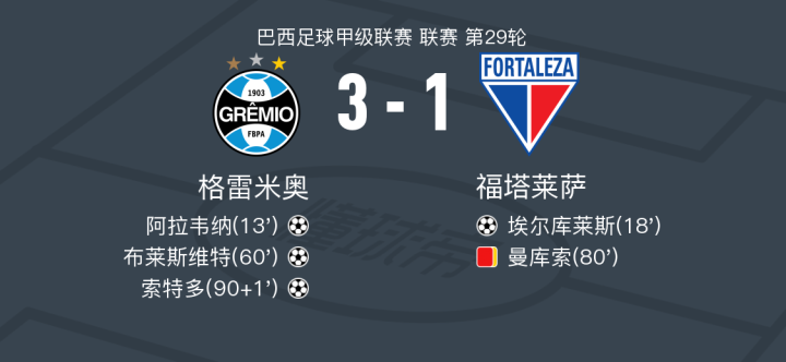 在巴西足球甲级联赛第29轮的较量中,格雷米奥坐镇主场迎战福塔莱萨。比赛中,格雷米奥的阿拉韦纳率先为球队打开局面,随后福塔莱萨的埃尔库莱斯在皮卡丘的助攻下迅速扳平比分。下半场,格雷米奥的布莱斯维特在多蒂的助攻下再次将比分超出。比赛接近尾声时,福塔莱萨的曼库索被罚下场,格雷米奥抓住机会,由索特多在schlemper igor的助攻下锁定胜局。最终,格雷米奥以3-1战胜福塔莱萨,取得了本场比赛的胜利。