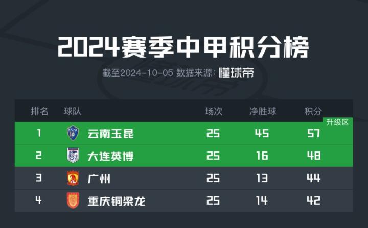 目前,云南玉昆共积57分排名中甲积分榜榜首,在比赛还剩5轮的情况下,仅有大连英博、广州以及重庆铜梁龙有机会在积分上追赶上云南玉昆。