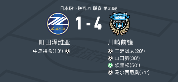北京时间10月5日日本职业联赛J1 联赛 第33轮,町田泽维亚主场对阵川崎前锋。町田泽维亚中岛裕希破门。川崎前锋三浦飒太破门,山田新破门,马尔西尼奥破门,埃里松破门。最终比分町田泽维亚 1-4 川崎前锋。