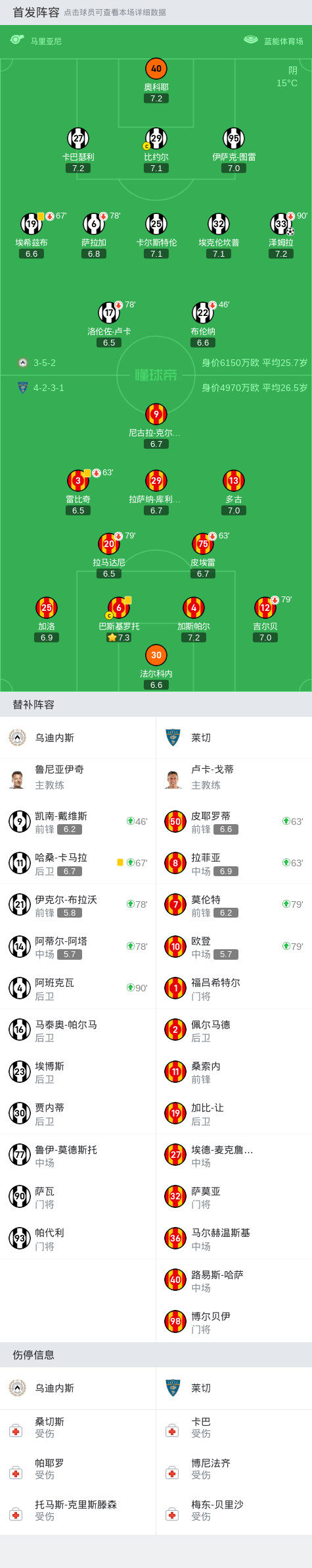 乌迪内斯1-0莱切,泽姆拉一球制胜战报bot @懂球帝2024-10-05 22:55在意大利足球顶级联赛第七轮的较量中,乌迪内斯坐镇主场迎战莱切。比赛中,乌迪内斯的泽姆拉成功破门,打入了全场唯一的进球,最终乌迪内斯以1比0战胜莱切,取得了本场比赛的胜利。点击查看本场比赛详细数据>>点击查看意甲完整积分榜>>精彩瞬间第75分钟,乌迪内斯球员泽姆拉打入一球。球队阵容技术统计展开更多