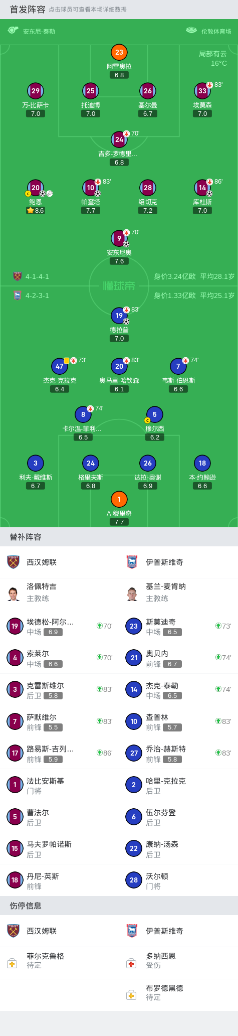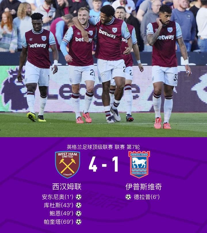 在英格兰足球顶级联赛第七轮的比赛中,西汉姆联坐镇主场迎战伊普斯维奇。比赛伊始,西汉姆联的鲍恩展现出色的视野,为安东尼奥送出精准助攻,帮助球队取得领先。伊普斯维奇迅速做出回应,德拉普凭借个人能力扳平比分。随后,西汉姆联的库杜斯展现了他的进攻才华,再次为主队取得领先优势。 比赛进入下半场,鲍恩继续他的出色表现,亲自攻入一球,进一步扩大了西汉姆联的领先优势。接着,帕奎塔也加入了进球的行列,为主队锁定胜局。最终,西汉姆联以4-1的比分战胜伊普斯维奇,取得了一场令人信服的胜利。
