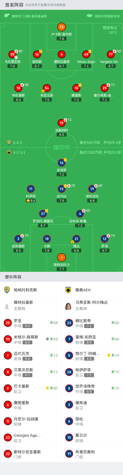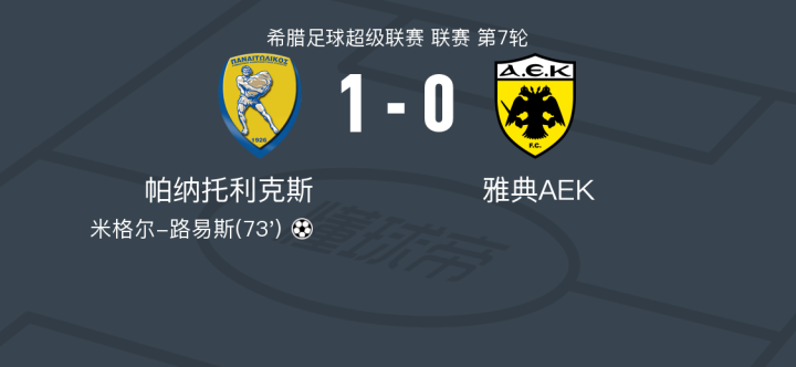 在希腊足球超级联赛第7轮的较量中,帕纳托利克斯坐镇主场迎战雅典AEK。比赛中,帕纳托利克斯的米格尔-路易斯在队友马夫里亚斯的精妙助攻下成功破门,为球队取得领先。最终,帕纳托利克斯以1-0战胜雅典AEK,取得了本场比赛的胜利。