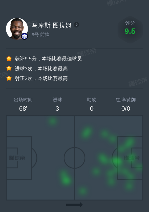 马库斯-图拉姆vs都灵全场数据:3进球,2次关键传球