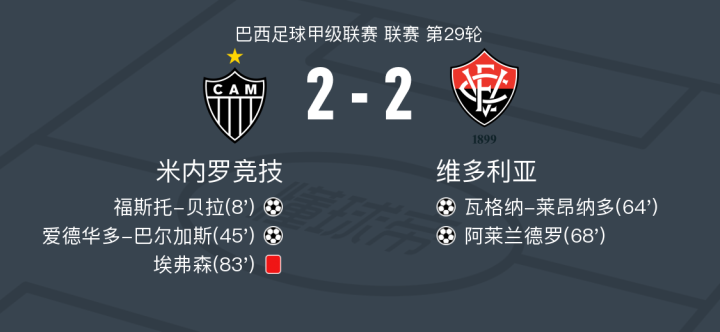 在巴西足球甲级联赛第29轮的较量中,米内罗竞技坐镇主场迎战维多利亚。比赛中,米内罗竞技的福斯托-贝拉在爱德华多-巴尔加斯的助攻下率先破门,随后爱德华多-巴尔加斯再度建功,为球队扩大领先优势。维多利亚方面,瓦格纳-莱昂纳多在马特乌斯的助攻下扳回一城,紧接着阿莱兰德罗在里卡多-里勒的助攻下将比分扳平。比赛接近尾声时,米内罗竞技的埃弗森被罚下场。最终,双方以2-2握手言和。