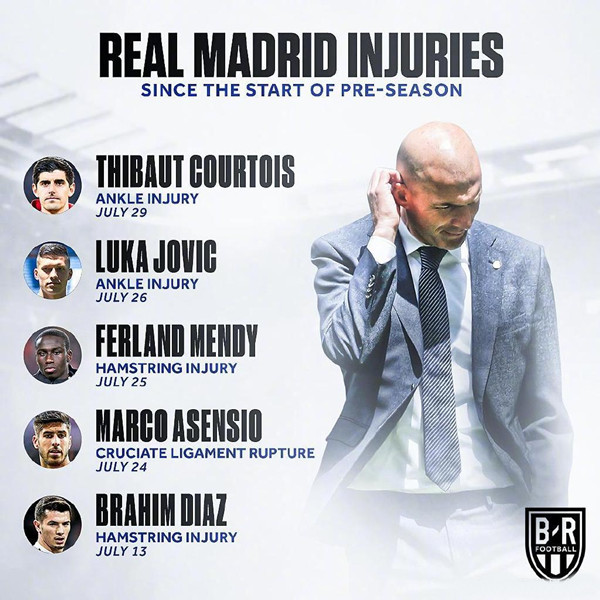 2016/17赛季前期,皇马主力阵容中除卡瓦哈尔以外皆有伤停记录,齐达内开发出“AB队”分工模式,才得以摆脱伤病困扰。2019/20赛季前期,皇马的伤员几乎可以拼凑出一套首发阵容,阿森西奥早早赛季报销,伊斯科和库尔图瓦长时间休战,三名新援更是轮流受伤,阿扎尔的不幸遭遇更是对球队的重建产生了深远影响。