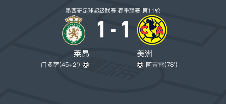 莱昂1-1美洲,门多萨破门,阿吉雷扳平战报bot2024-10-06 13:10在墨西哥足球超级联赛春季联赛第11轮的较量中,莱昂坐镇主场迎战美洲。比赛中,莱昂的门多萨在队友瓜尔达多的精妙传球下成功破门,为主队取得领先。随后,美洲的阿吉雷接到阿尔瓦罗-菲达尔戈的助攻,帮助球队扳平比分。最终,双方以1-1握手言和。点击查看本场比赛详细数据>>点击查看墨超完整积分榜>>精彩瞬间上半场补时第2分钟,莱昂球员瓜尔达多助攻门多萨打入一球。第78分钟,美洲球员阿尔瓦罗-菲达尔戈助攻阿吉雷打入一球。 球队阵容 技术统计 展开更多