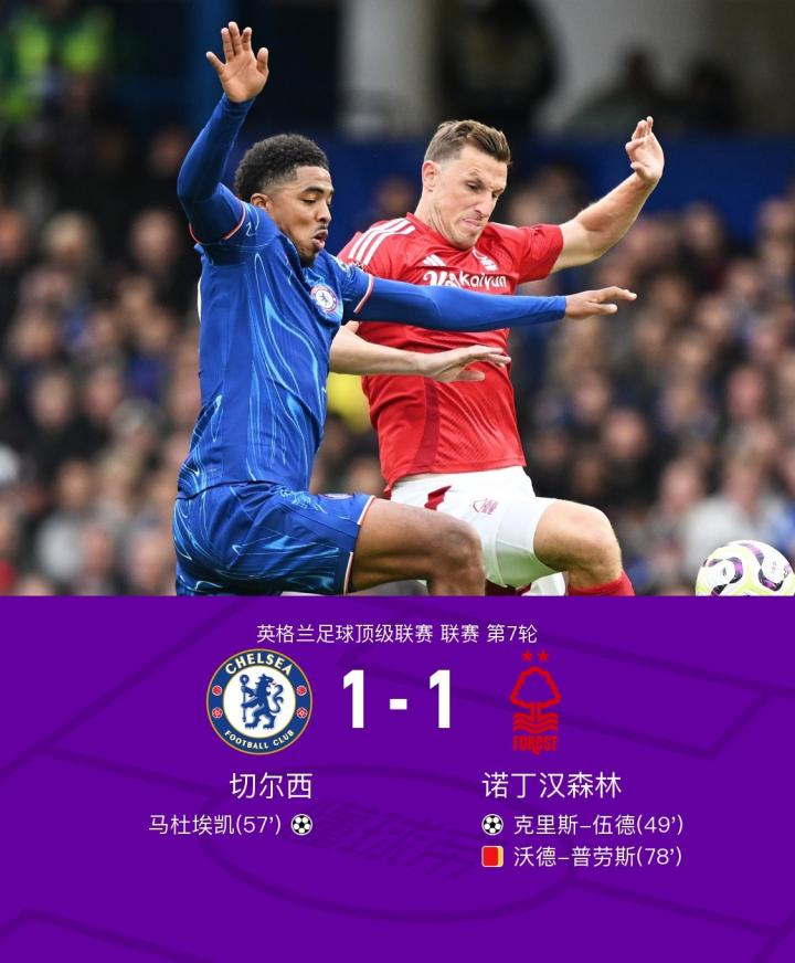 在英格兰足球顶级联赛第7轮的较量中,切尔西坐镇主场迎战诺丁汉森林。比赛中,米伦科维奇送出助攻,克里斯-伍德成功破门,为球队先拔头筹。随后,帕尔默同样贡献了一次助攻,马杜埃凯抓住机会,将比分扳平。比赛后期,沃德-普劳斯因累计两张黄牌被罚下场。最终,双方以1-1握手言和,各取一分。