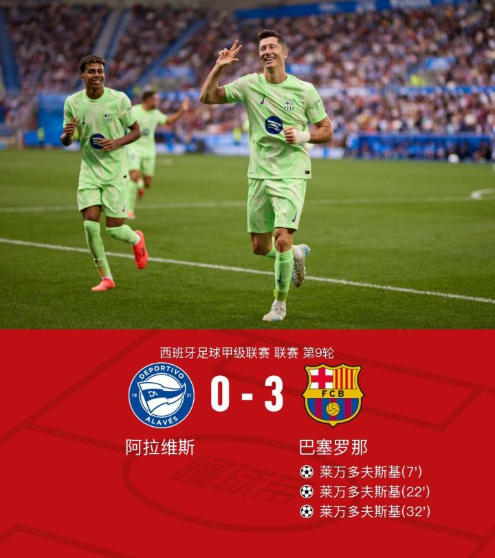 第31分钟,埃里克助攻,莱万31分钟戴帽,巴萨3-0阿拉维斯