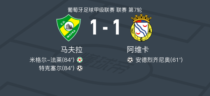 在葡萄牙足球甲级联赛第7轮的较量中,马夫拉坐镇主场迎战阿维卡。比赛中,阿维卡的安德烈齐尼奥率先为球队取得进球,展现了出色的个人能力。随后,马夫拉的特克塞尔也不甘示弱,为主队扳平比分。值得一提的是,马夫拉的米格尔-法莱曾获得点球机会,但未能将其转化为进球。最终,双方以1-1握手言和,各取一分。