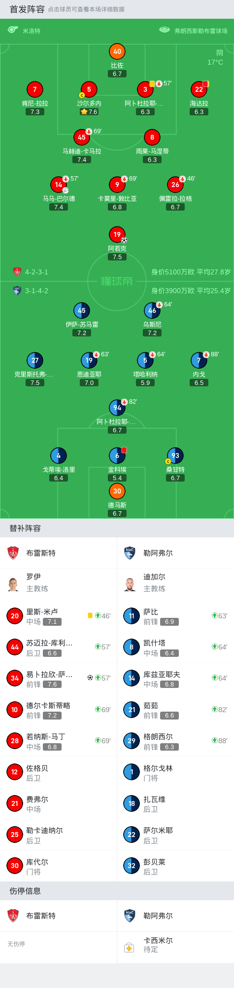 布雷斯特2-0勒阿弗尔,阿若克建功,易卜拉欣-萨拉赫锁定胜局