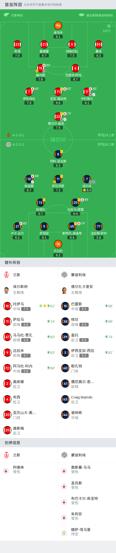 兰斯4-2蒙彼利埃,托伊马点射,奥马尔-迪亚基特建功