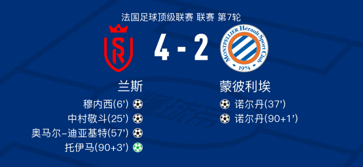 在法国足球顶级联赛第7轮的比赛中,兰斯坐镇主场迎战蒙彼利埃。比赛中,兰斯的穆内西率先打破僵局,随后中村敬斗也为球队再下一城。蒙彼利埃的诺尔丹在队友哈兹里的助攻下扳回一球。兰斯的奥马尔-迪亚基特在中村敬斗的助攻下再次扩大领先优势。比赛接近尾声时,诺尔丹为蒙彼利埃再入一球,但兰斯的托伊马通过点球锁定胜局。最终,兰斯以4-2战胜蒙彼利埃,取得了本场比赛的胜利。