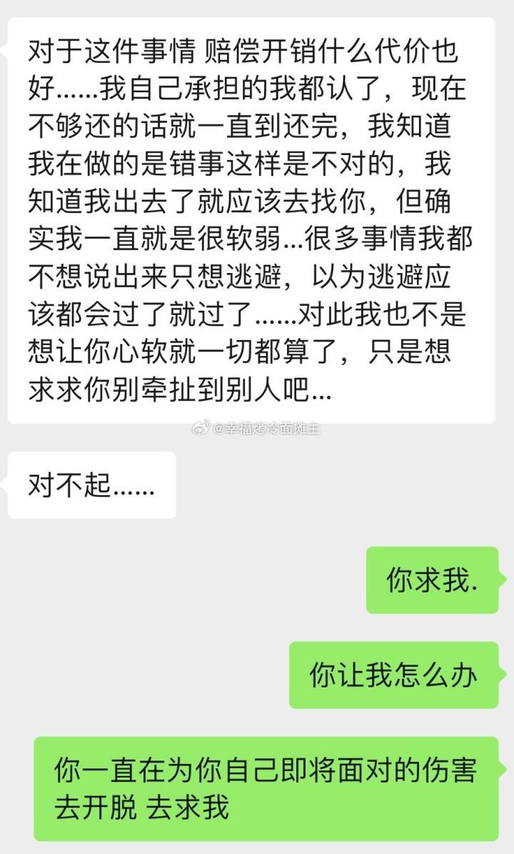 相信你一次次的是我活该 从今天起不再替你遮掩任何问题 收拾任何残局 任何的事件求锤得锤 聊天记录 录音 一切证据我都有 你有任何觉得冤枉可以起诉我 我随时等候。