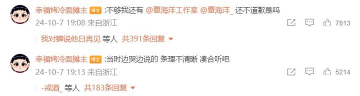 之后覃海洋未婚妻还在评论区表示:“不够我还有,还不道歉是吗”、“当时边哭边说的,条理不清晰,凑合听吧。”