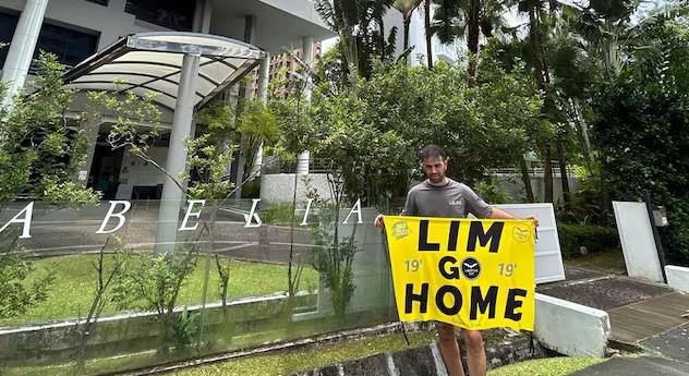 达尼-奎斯塔在林荣福的家门口拉起了“林荣福回家”的横幅,还在林荣福家边门贴了一张“林荣福下课”的贴纸。在前往林荣福家之前,达尼-奎斯塔已经举着“林荣福回家”的横幅打卡了新加坡的多个景点。