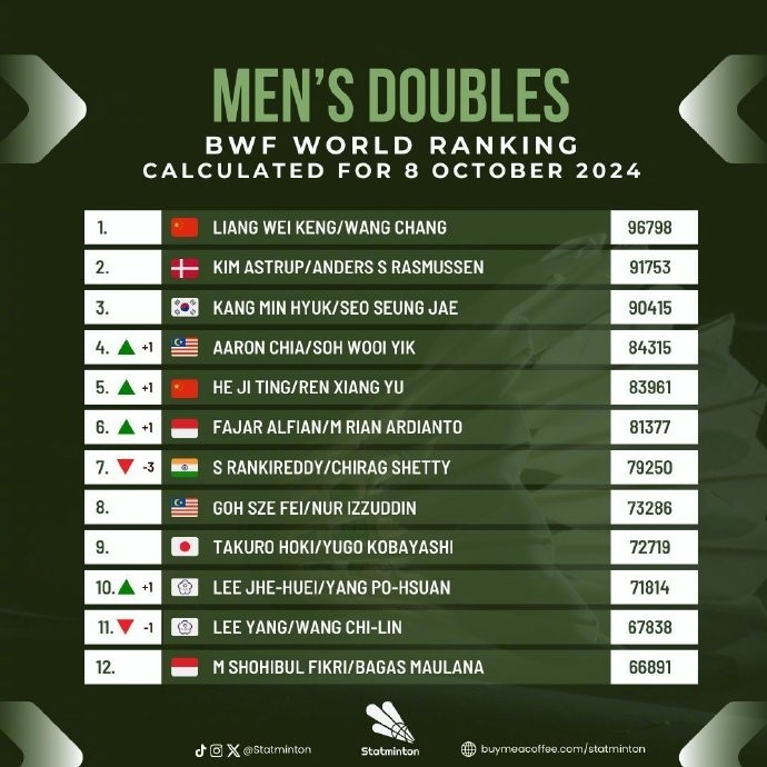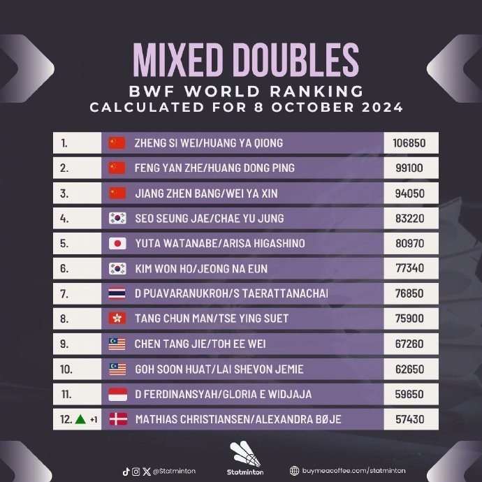在上一期排名中,男单、男双、女双、混双世界第一已经都是中国球员,其中男单为石宇奇、男双为梁伟铿/王昶、女双为陈清晨/贾一凡、混双为郑思维/黄雅琼。