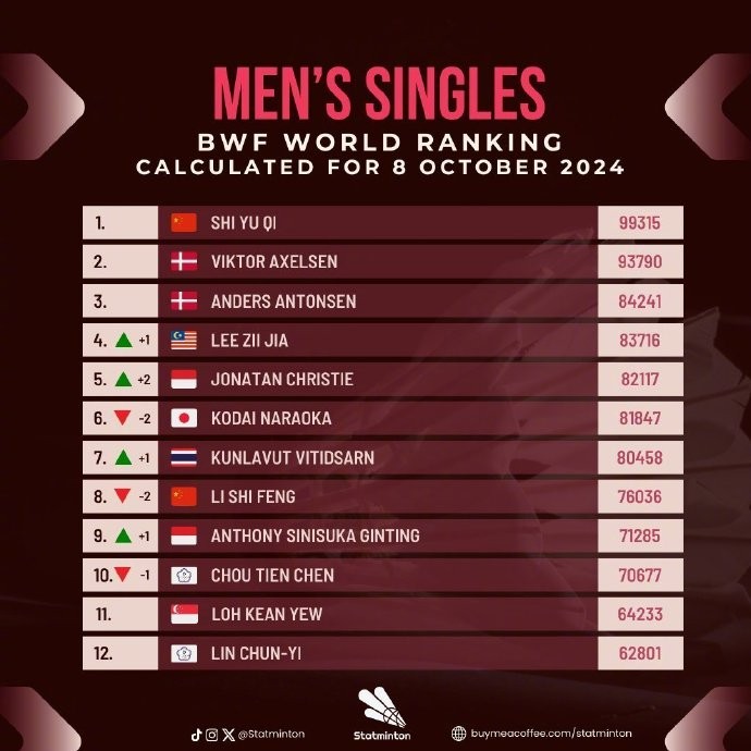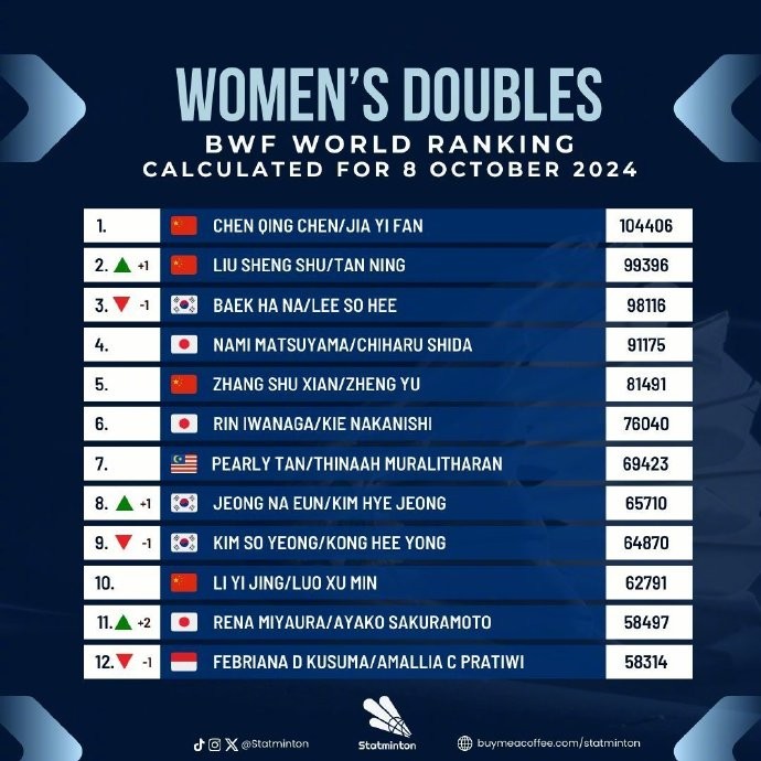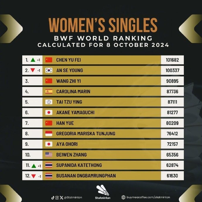 《北京青年报》报道,根据世界羽联相关规定,去年同期赛事获得的积分会被移除。安洗莹在杭州亚运会夺冠时获得的5580分不复存在。而陈雨菲虽然在亚运会上获得亚军所拿到的1800分也被移除,但积分减少幅度小于安洗莹,因此成为了新的女单世界第一,两人的世界羽联最新积分分别为101682分和100337分。