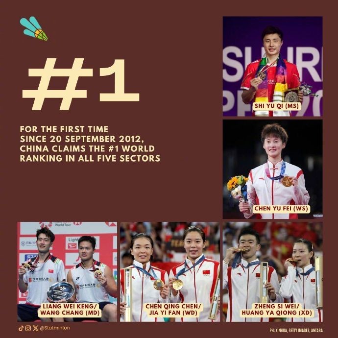 而上一次中国羽毛球队包揽五个单项世界第一还是在伦敦奥运会后的2012年9月20日,当时各单项第一分别为林丹、王仪涵、蔡赟/傅海峰、田卿/赵芸蕾、徐晨/马晋。