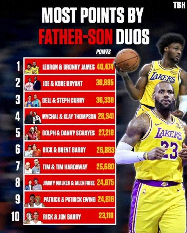 而外媒也对NBA历史上的父子组合合砍得分进行了排行,勒布朗-布朗尼组合也被加入排行榜,尽管布朗尼生涯还没有过得分,但凭借着勒布朗历史第一高的个人得分40474分,父子二人一举成为了该排行榜的头名。