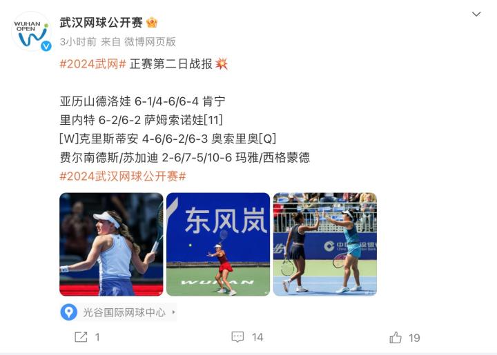 在武汉网球公开赛官方账号中,按照往常在发布战报时会放上胜者的照片,而今天的武网官方也仅是宣布了比赛结果,未放里内特的照片。