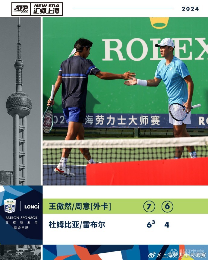 北京时间10月8日,2024上海劳力士大师赛男双正赛首轮,持外卡出战的中国组合周意/王傲然直落两盘,以7-6(3)、6-4,大比分2-0战胜法国组合杜姆比亚/雷布尔,成功晋级16强。值得一提的是,法国组合也是今年ATP250成都站的男双冠军。