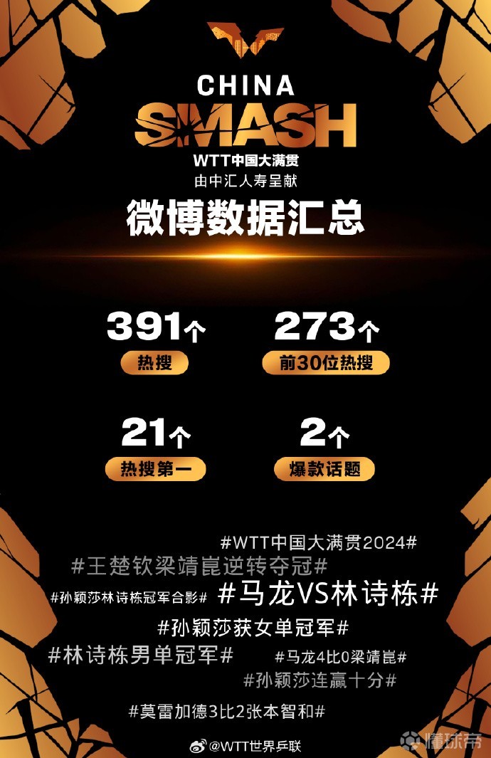 WTT中国大满贯:11天微博热搜391个,热搜第一21个