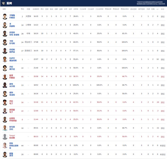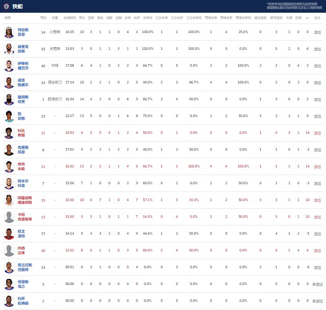 洛杉矶快船哈登14分4板2助,凯-琼斯13分5板1帽,乔丹-米勒13分2板2助1断1帽;