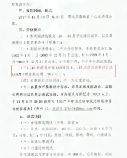 近日,内蒙古足球协会下发了《关于中国足球学院来内蒙古自治区进行测试选拔的通知》,本次测试选拔为U18、U15男子足球运动员,在资格要求中可以看到,U18运动员的身高为185cm以上,U15运动员预计达185cm(现身高必须170cm以上)。